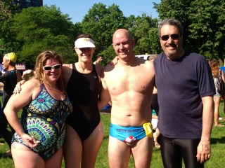Well this week I finally hit the open water! On June 1st it was the 5th Annual Charles River Swim. I have signed up for it for several times but have always been thwarted by “the dirty water” and the organizers canceling the swim. This year the water was clean enough to hold the event. It was a mile swim that started by the Fiedler footbridge and went between the Mass Ave Bridge and the Longfellow Bridge. I did ok. My sighting was off and I went way wide of the third buoy. I got third in my age group-eh. Below is a pic of my and my pals I swam with E2, KT and Dr. Bob. Oh and I wore my special Birthday suit from the Wishers. Scandalous.