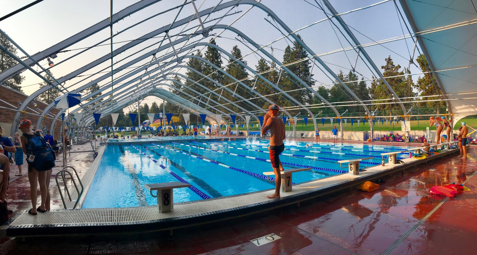 Not fully expecting it I was able to squeeze in another new pool on vacation. Pool #96 is the Sunriver Homeower’s Aquatic Recreation Center in Sunriver, Oregon. Sunriver is where we use to train in the winter when the Juniper Park pool closed down. The original pool was a heated outdoor rec pool with six lanes set up for lap swimming. It was fun to swim in the cold and snow with the steam rising from the pool. That pool was filled-in years ago and moved to another location. The new pool is a big outdoor family aquatic park with water slides, a lazy river with a three lane area sectioned off for lap swimming. Despite the warm pool water for family activities I was able to get several decent swims in.