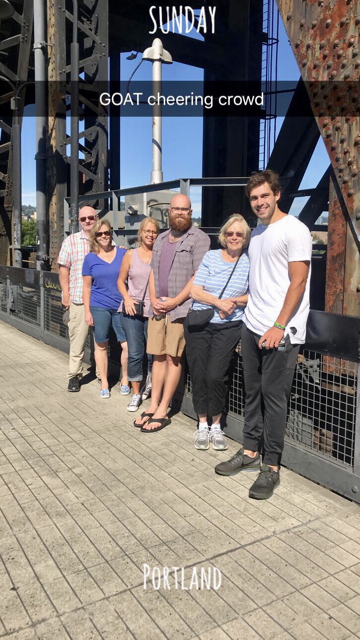 After the Ross Island Bridge it was a series of eight bridges pretty close together through downtown. I breathe to the left so it was easy to see the skyline and my stalwart support crew chatting with each other.