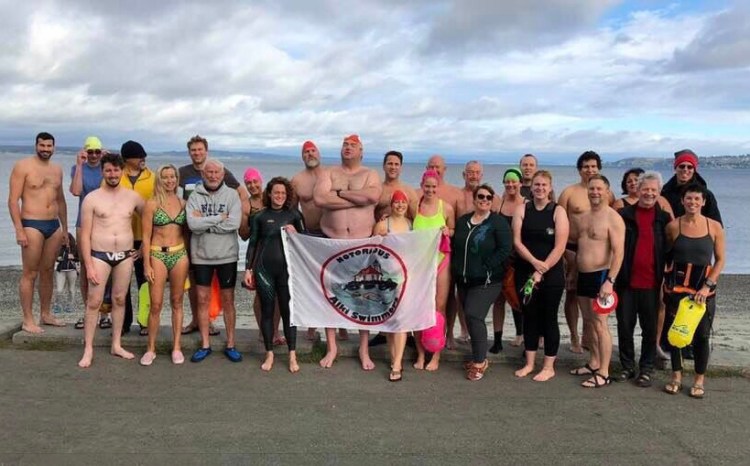 To cap off my open water swims I swam with the infamous Notorious Alki Swimmers at Alki Beach in West Seattle. They are a hearty group that were 20 plus strong on a somewhat clear Saturday morning. I got reacquainted with Jerome the leader of this merry band and former Nahant Knucklehead.