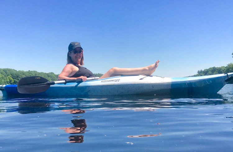 It was off to Lake Cochituate aka Pam’s Pond for the first open water swim of the season. Pam’s place is a waterfront home with outdoor showers, a hot tub and a beach to serve as a gathering spot for other swimmers~a swimmers paradise. The goal was to swim for 4.5 hours. My first time kayak support crew member was Shannon! This was going to be a fun day.