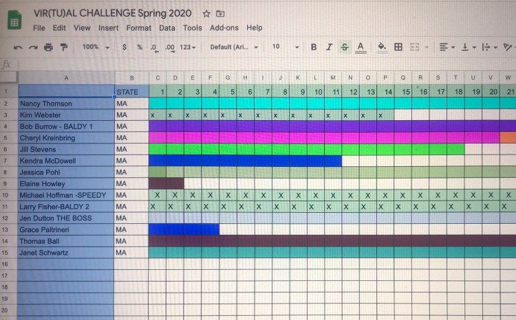 To keep us connected Coach Jen created a game where you can fill in square on a grid as you complete various activities. This has brought out the competitive spirit with some of my lane mates.