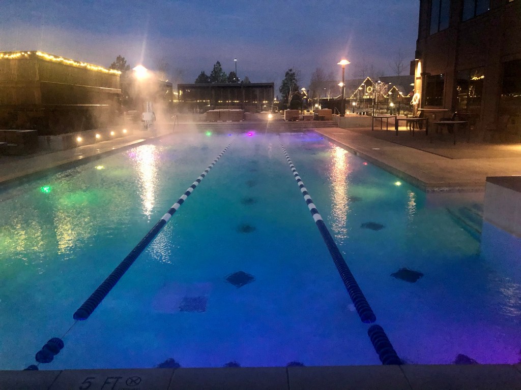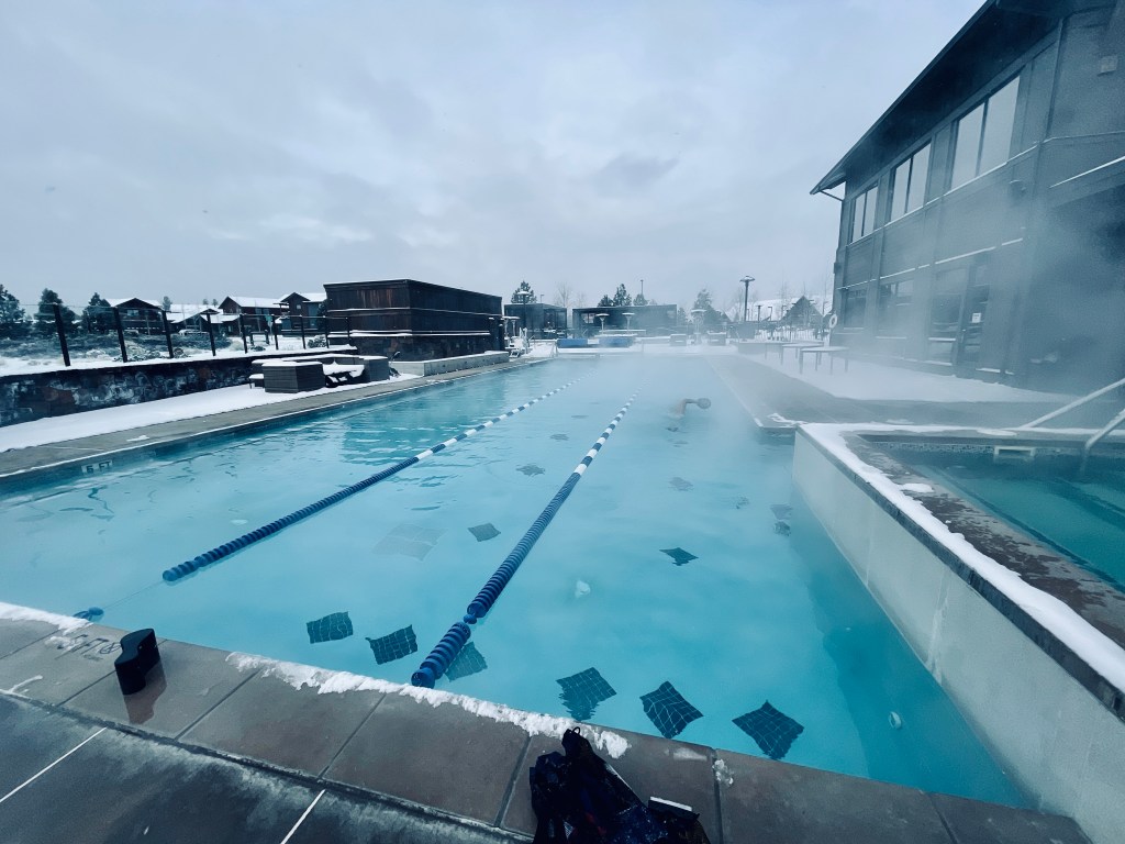 As my readers may recall from prior blogposts indoor pools in Oregon have been shut since mid-November and outdoor pools opened on December 2nd. Fortunately, for me, the pool at Tetherow opened. Likely the only open pool within a 100 miles. It is only two lanes and a bit warm but that was ok. Since that time I swam 4 to 5 days a week in the dark in the light and in all types of weather, clear blue skies, somewhat cold, cold, windy conditions (aka-pool whitecaps), rain and even snow. It was becoming my new pool and routine.