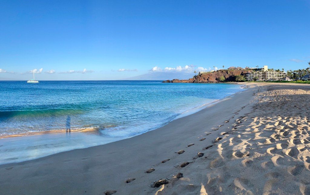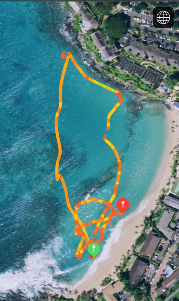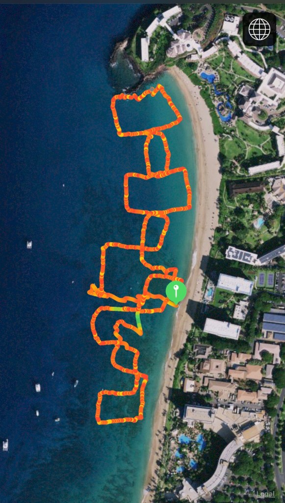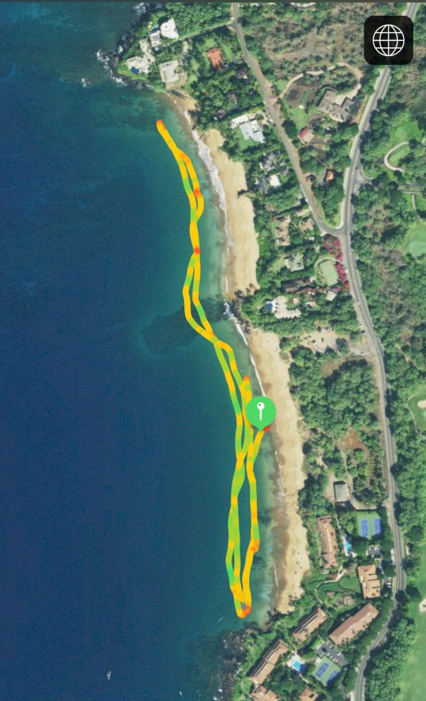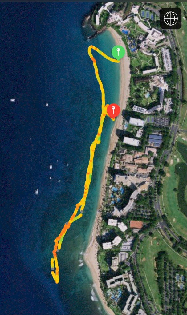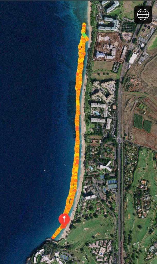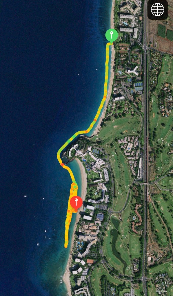 Home base was Kaanapali Beach. It is a long, long beach separated by Black Rock. The water is calm, clear, a great color of blue and importantly warm. It was my playground I had short swims, longs swims, straight swims and weird shapes and patterns. Below are a handful of my most memorable swims along this stretch of sand.