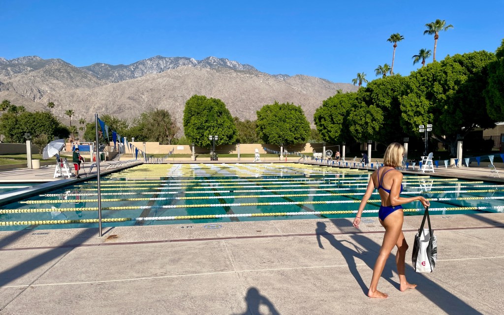 Yes-I was able to get some swimming in at the Palm Springs Aquatic Center (a repeat pool #…#100 & #101~Milestones). Covid rules applied such as; reservations, 45 minute time slots, mandatory shower, and social distancing. The backdrop of the San Jacinto mountains set behind the pool made it a perfect way to start the mornings.