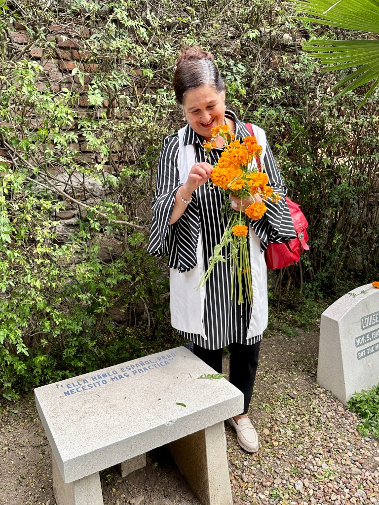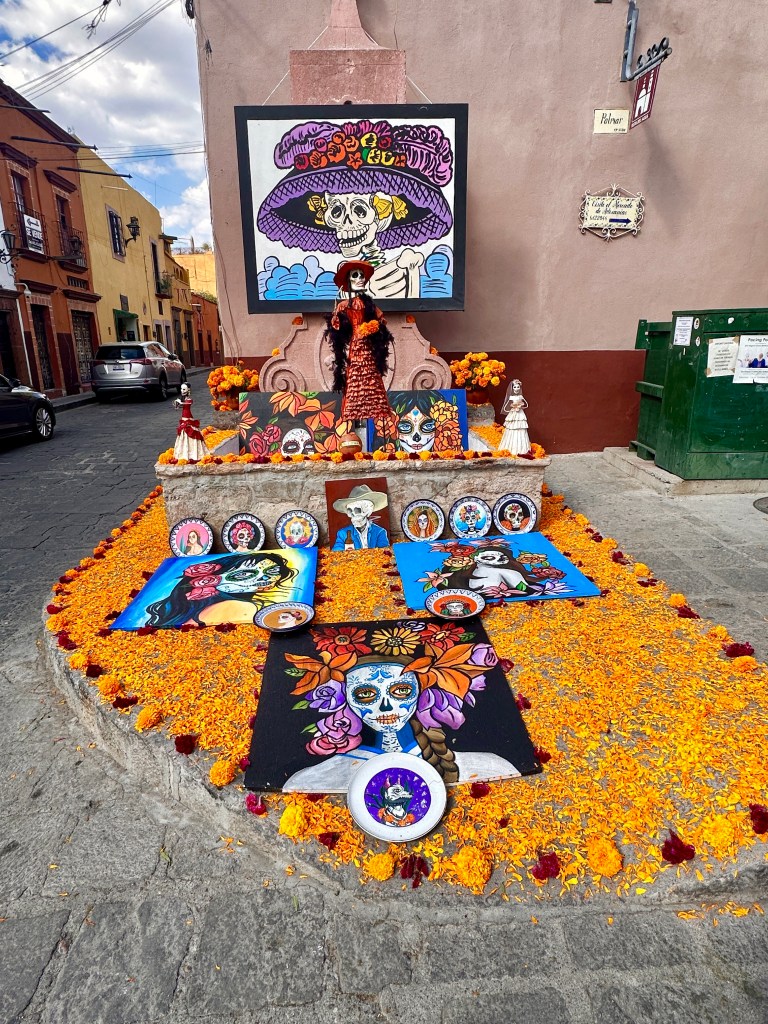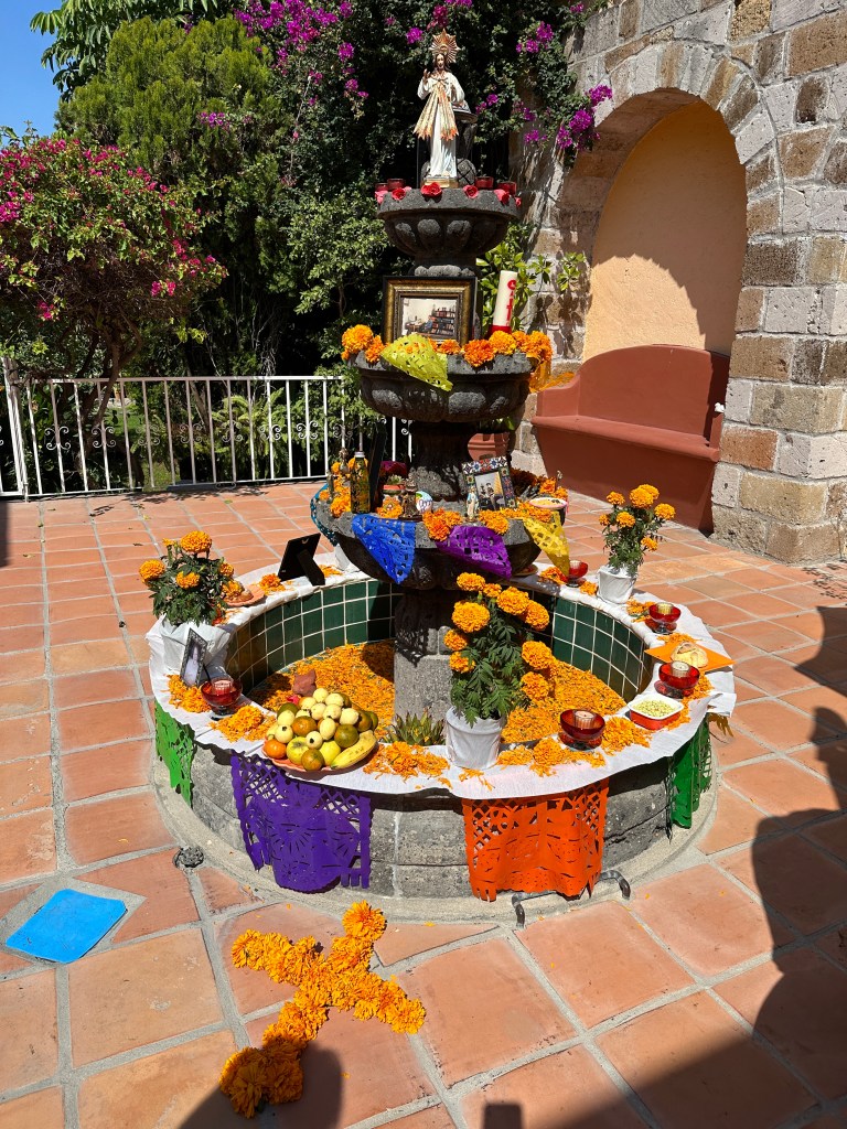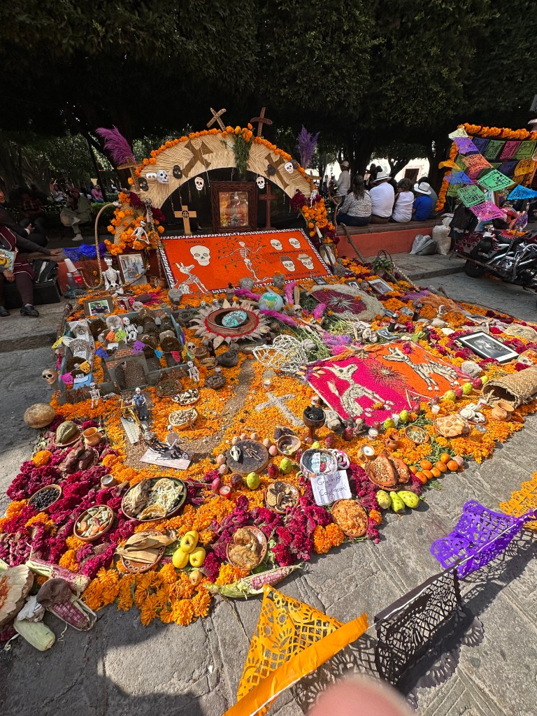 The timing of our trip was perfecto as it coincided with Dia de Muerto festivities. While the name translates to Day of the Dead it is a joyful celebration of remembrance of deceased loved ones. Bright flowers primarily, cempasuchils (marigolds) festooned the calles, tiendas, restaurants and public spaces along with ofrendas (alters) to recorder (remember) the dead.
