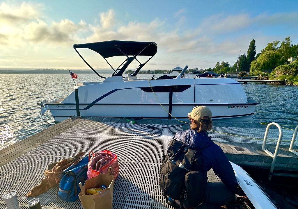We had a built in support crew in Seattle. Jane’s son Kevin provided kayak support and mi hijos Ryan & Courtney provided support and guidance from a boat. Ryan’s checked out a boat from his company, Purewater Craft. They make electric outboards and just started manufacturing electric pontoon boats. It was really cool pontoon and quiet.
