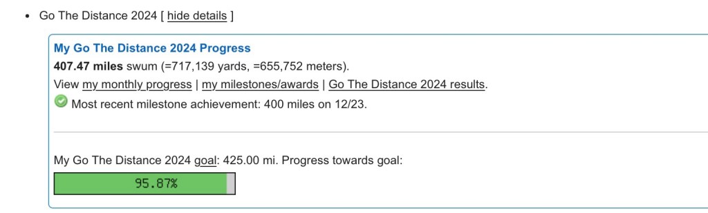 I swam 407 miles this year versus 446 miles last year. My goal was to swim 425 miles so I was 96% to goal. It’s not a 100% but I will take it! The distance swum is equivalent from swimming from our house to the Juniper Park Pool 69 times.