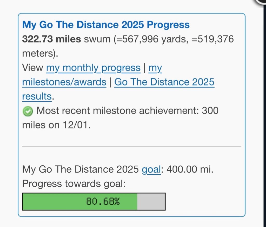 I swam 323 miles this year as opposed to 407 miles last year. My goal was to swim 400 miles, so I was only 80% to goal. I didn’t hit my goal—although it is still a B grade on a grading scale 🤷🏼♂️. I generally feel okay about missing the mark as it was compensated by many other joys.